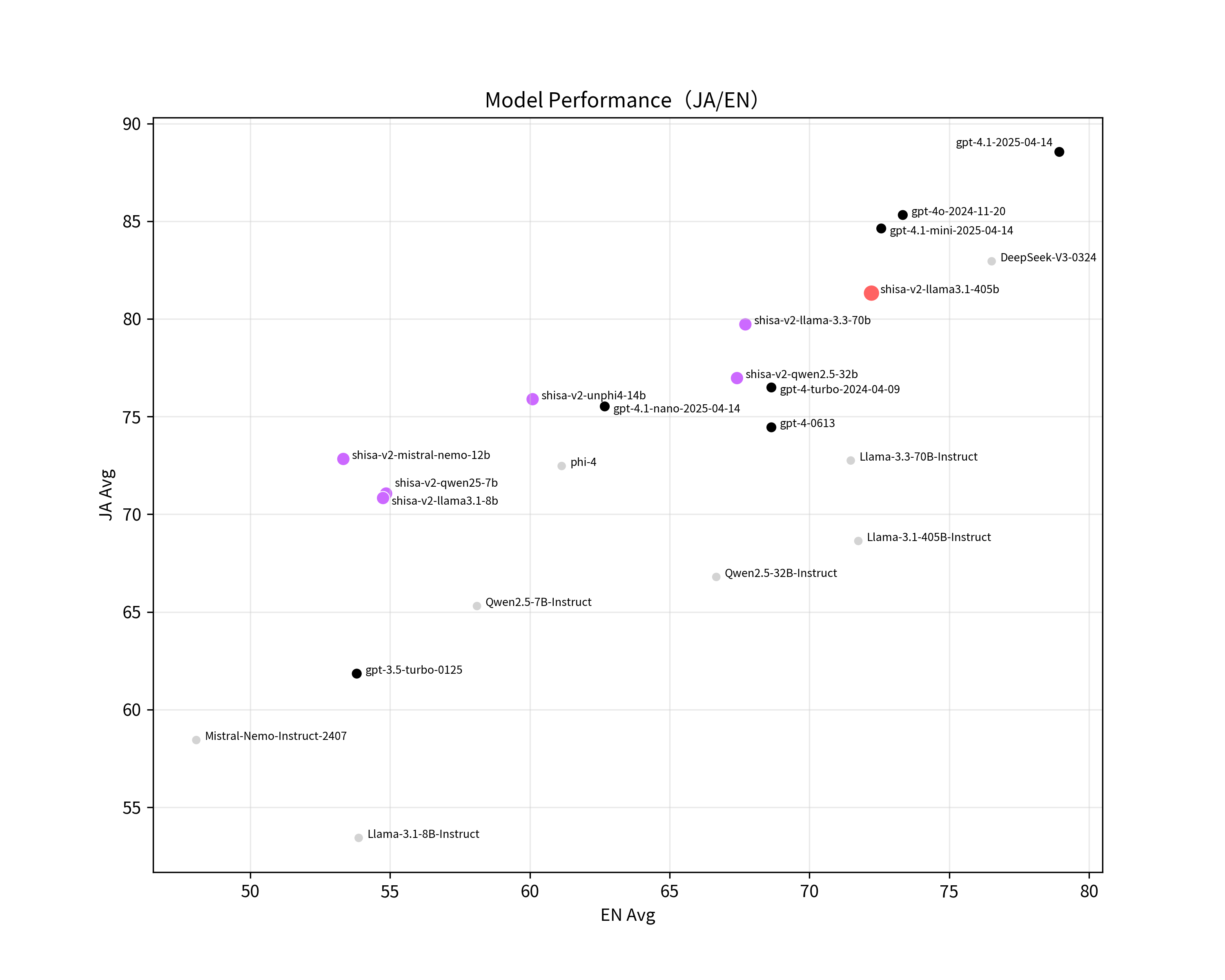 Most notably, Shisa V2 405B not only outperforms GPT-4 (0603) and GPT-4 Turbo (2024-04-09) in our JA/EN eval suites, but also goes toe-to-toe with the latest flagship models from US and Chinese labs like GPT-4o (2024-11-20) and DeepSeek-V3 (0324) in Japanese industry-standard benchmarks like Japanese MT-Bench.