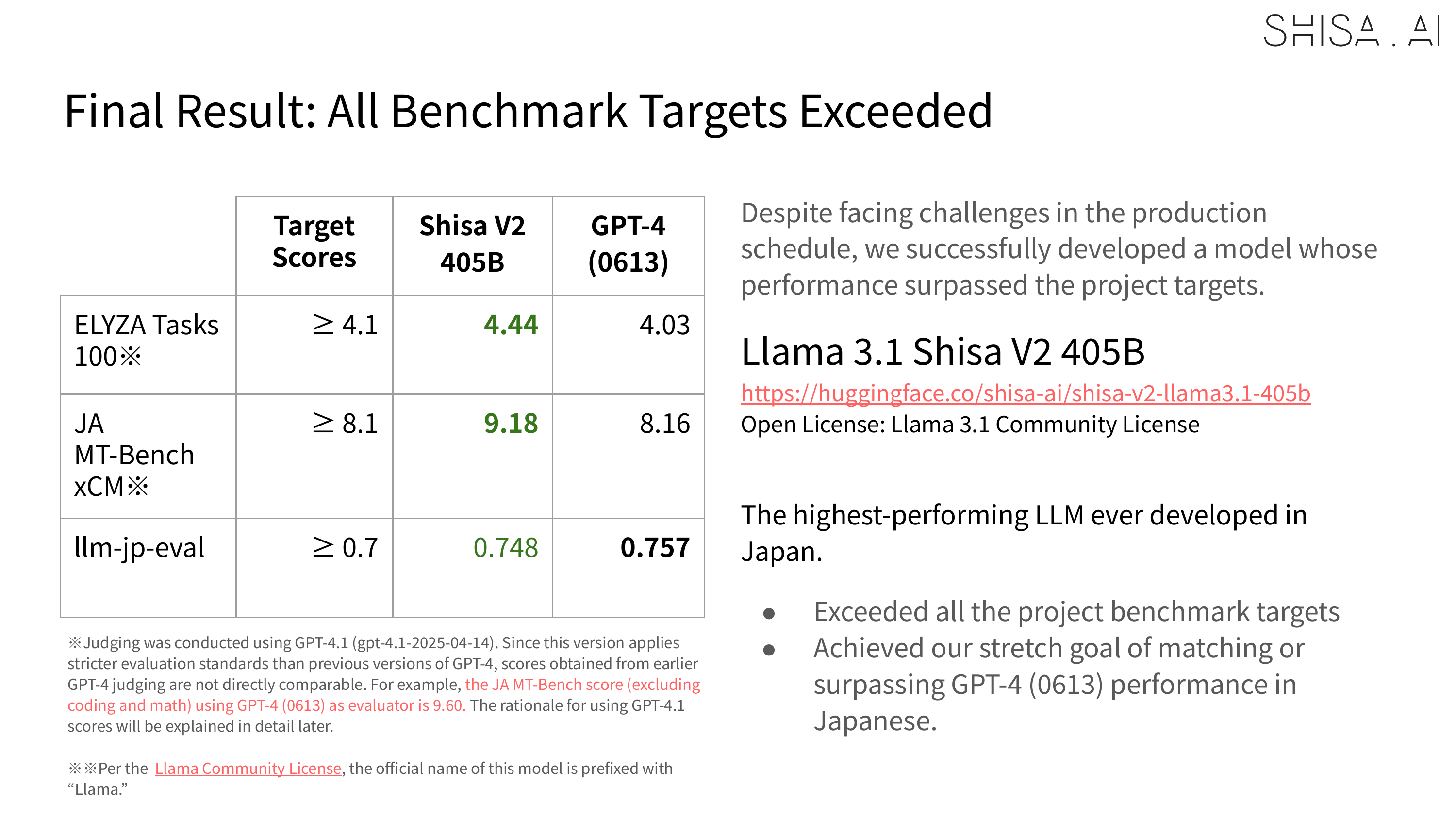 Shisa V2 405B is available for download now under the Llama 3.1 Community License at our Hugging Face repository:
