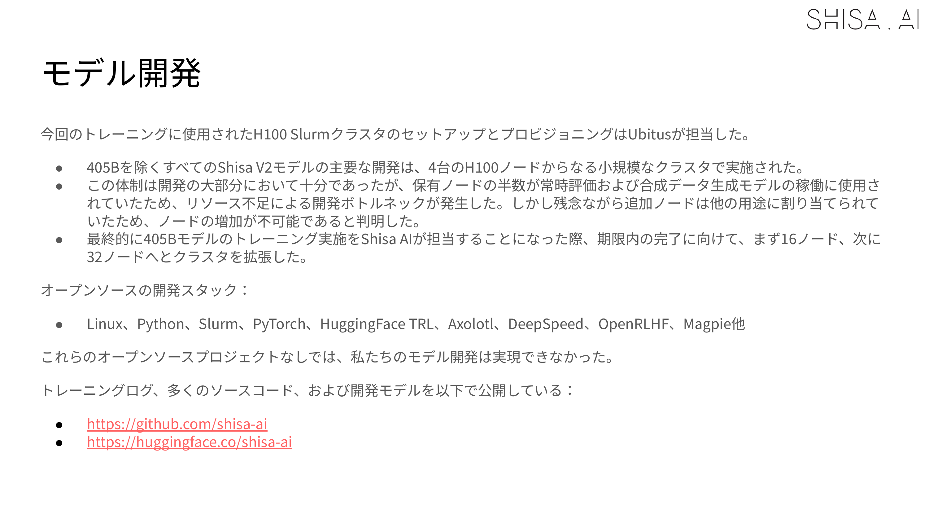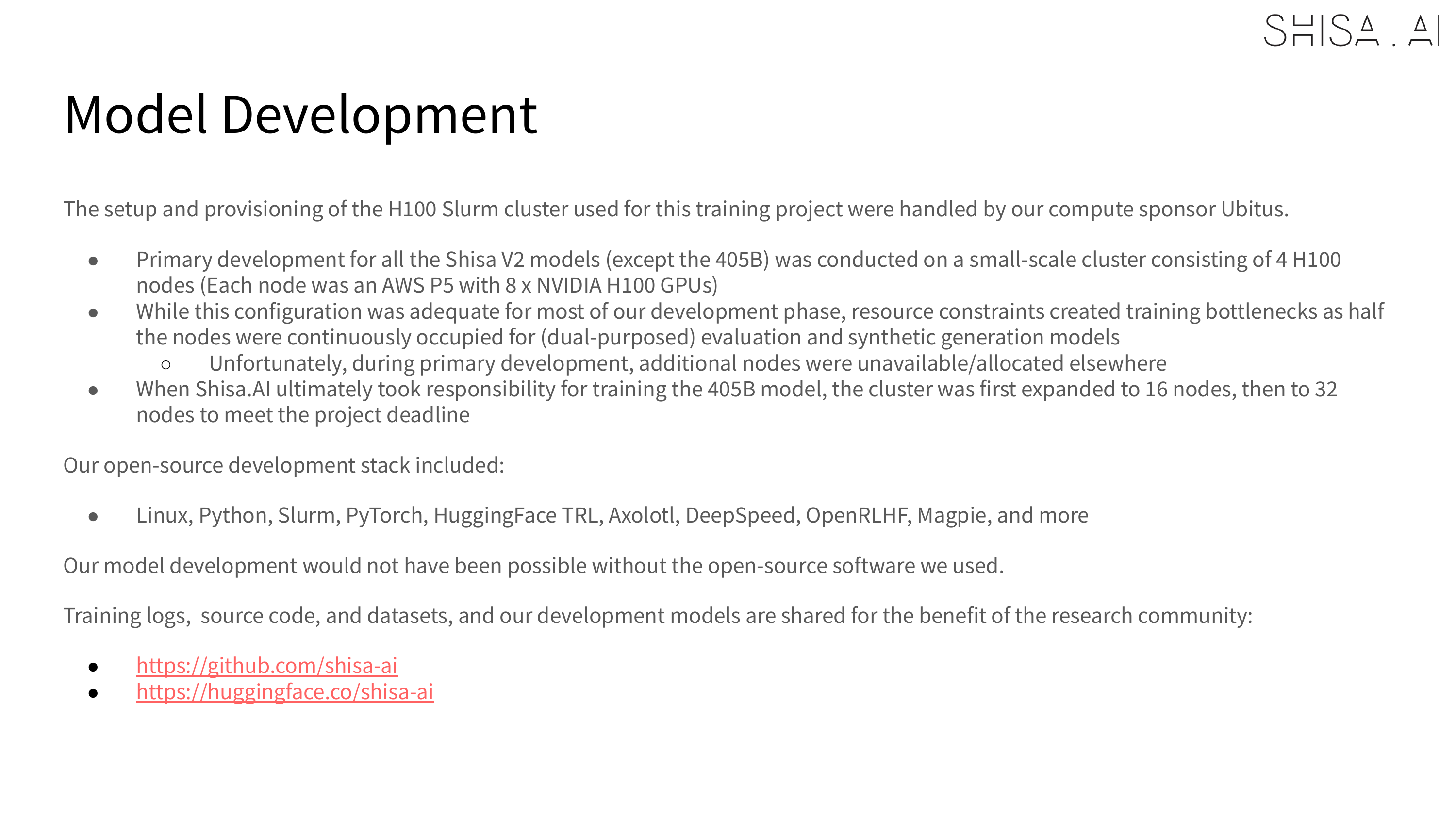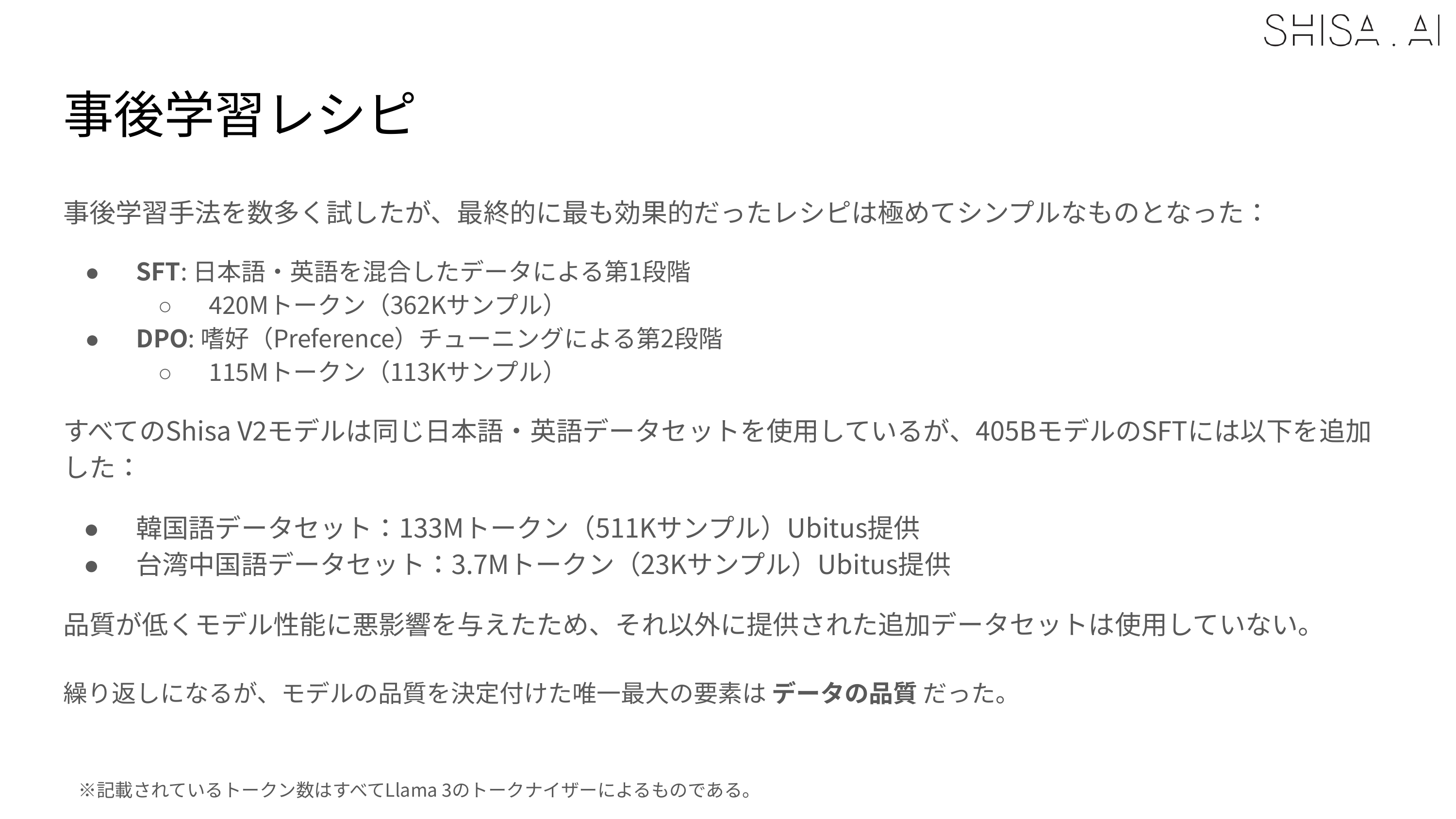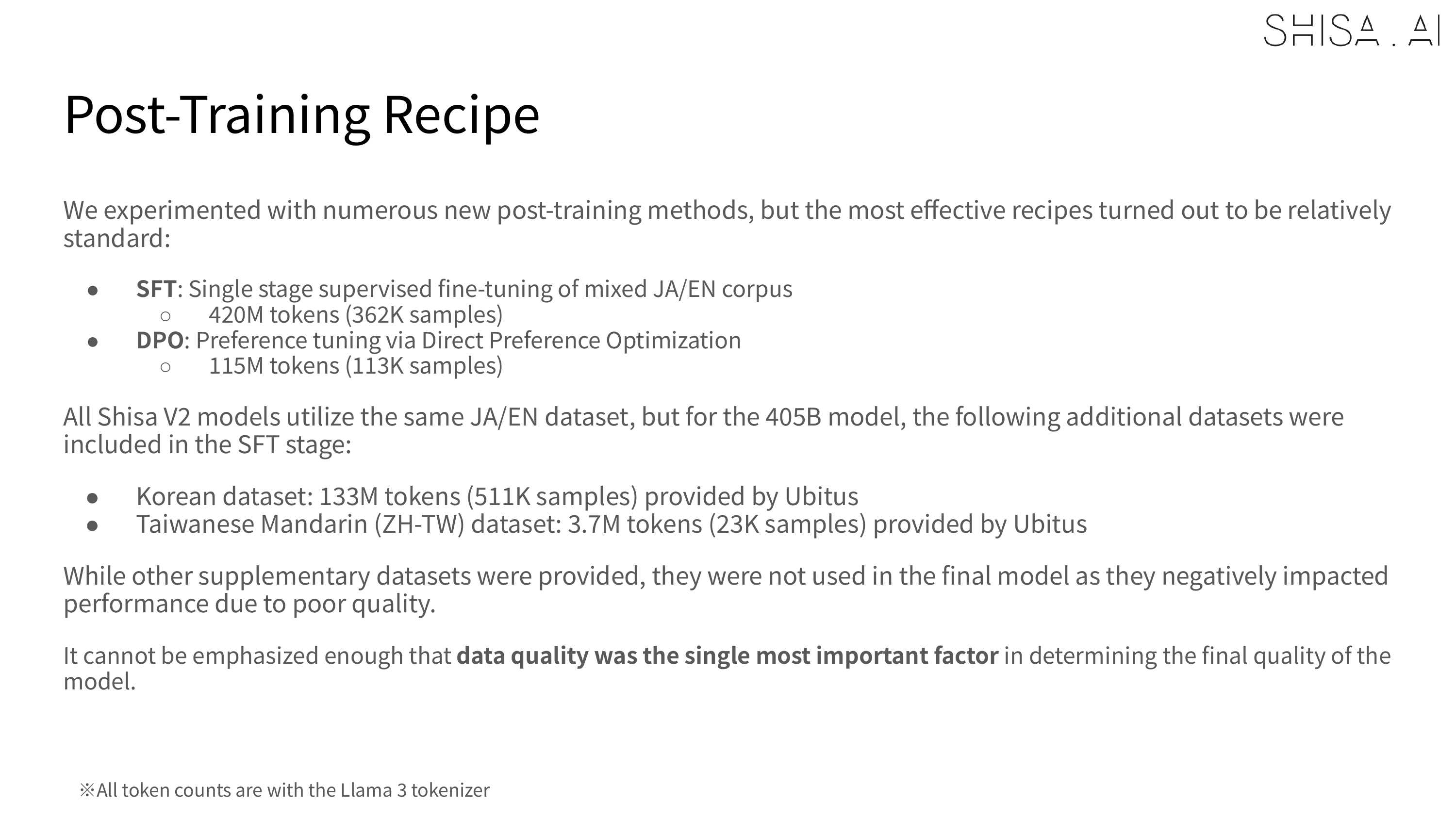 The compute for training Shisa V2 405B was generously provided by Ubitus K.K. and was significantly more resource-intensive compared to our other Shisa V2 model training.