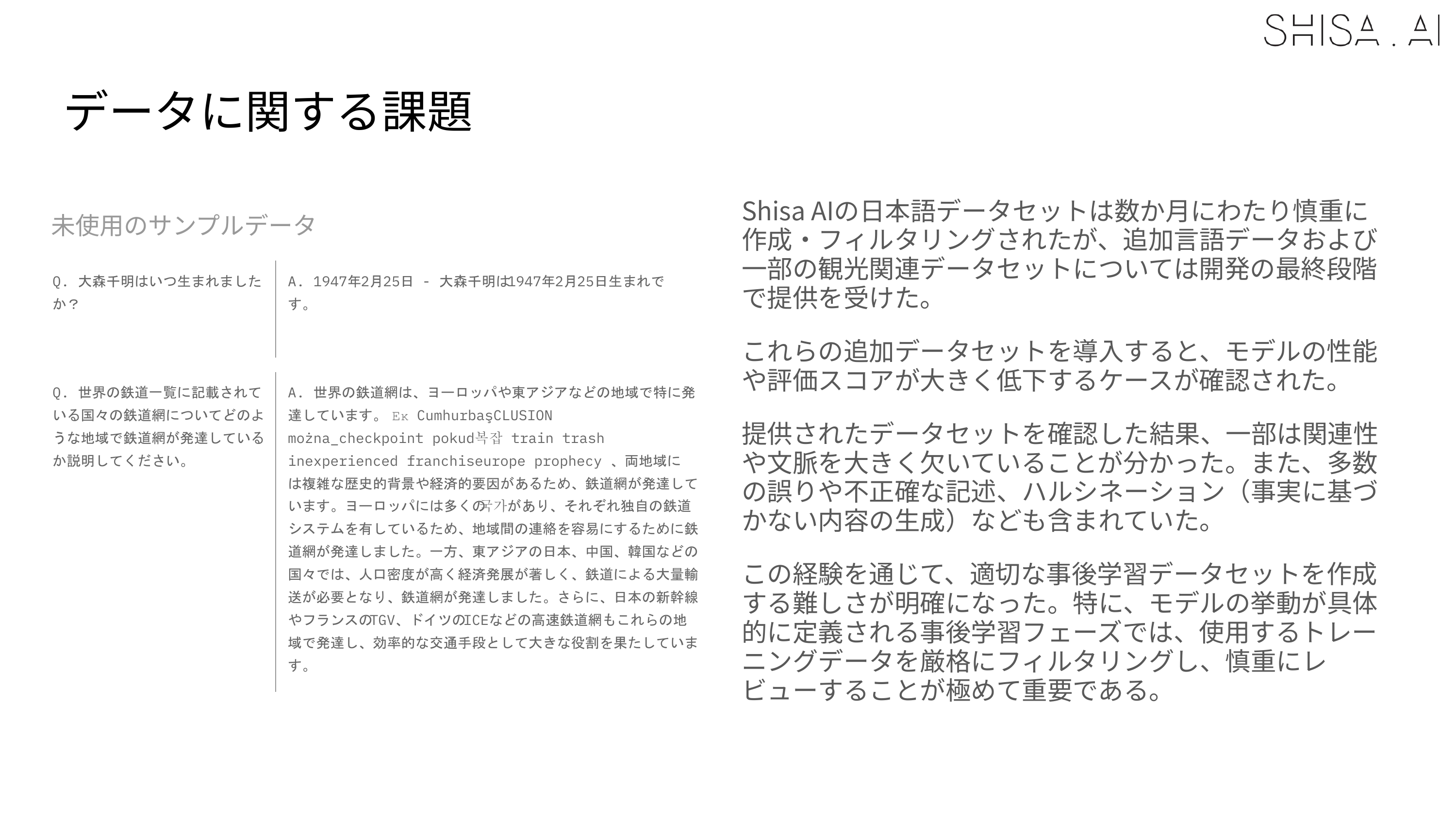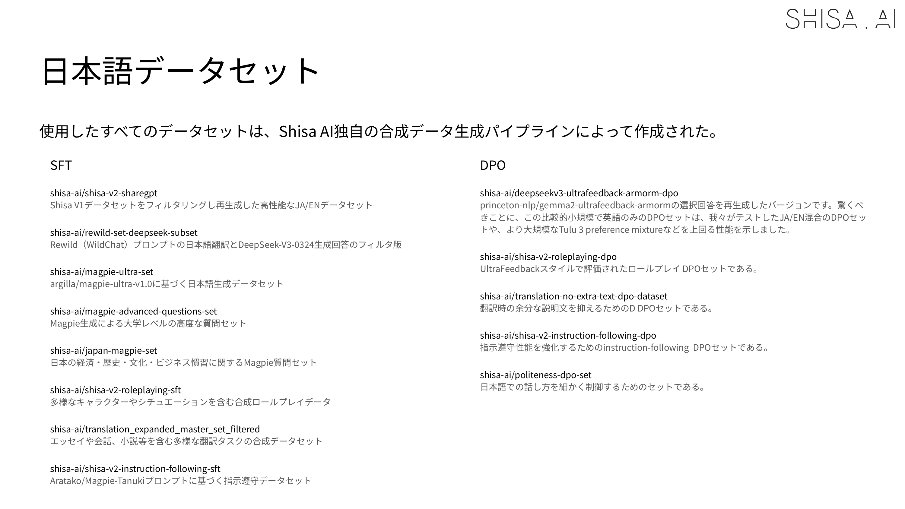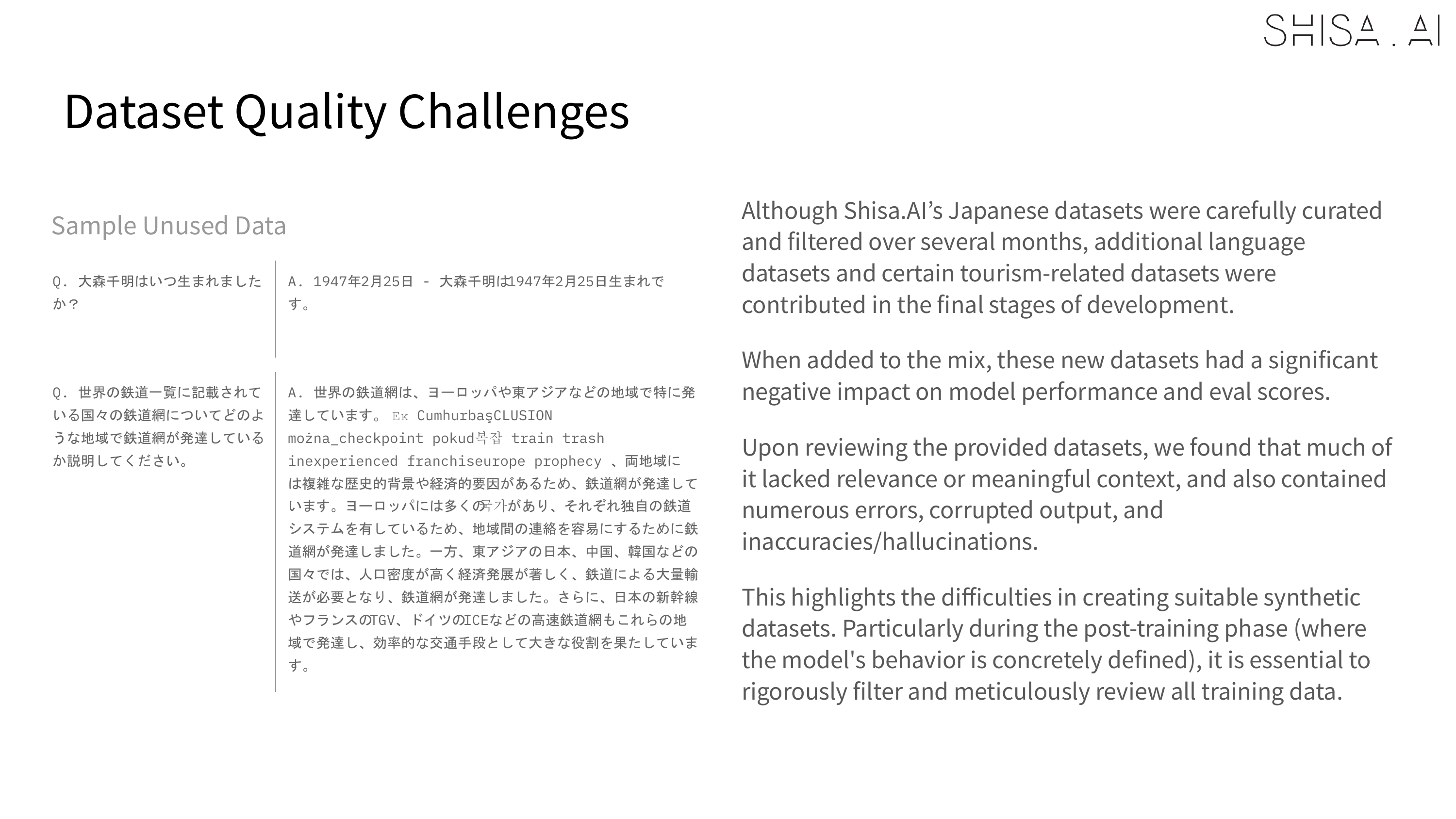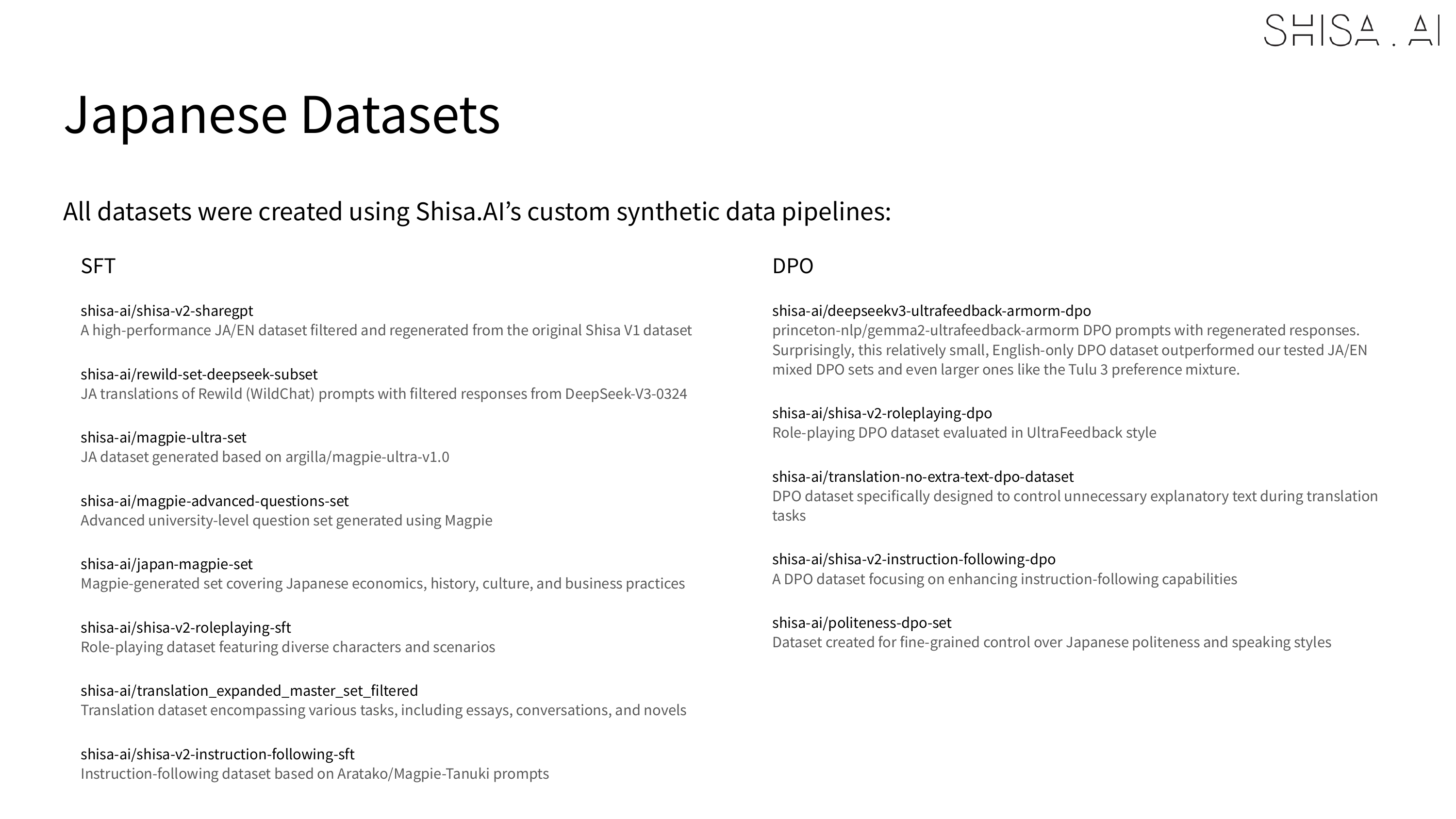 When we trained our first Shisa models, we discovered that most Japanese open models were running their final post-training on extremely flawed datasets and did our best to widely share our findings. Although the situation has improved dramatically in the past year, we still believe there is a big quality gap, especially in multilingual datasets, between open and closed-source models, and we believe that this is the highest impact contribution that can be made to the community.