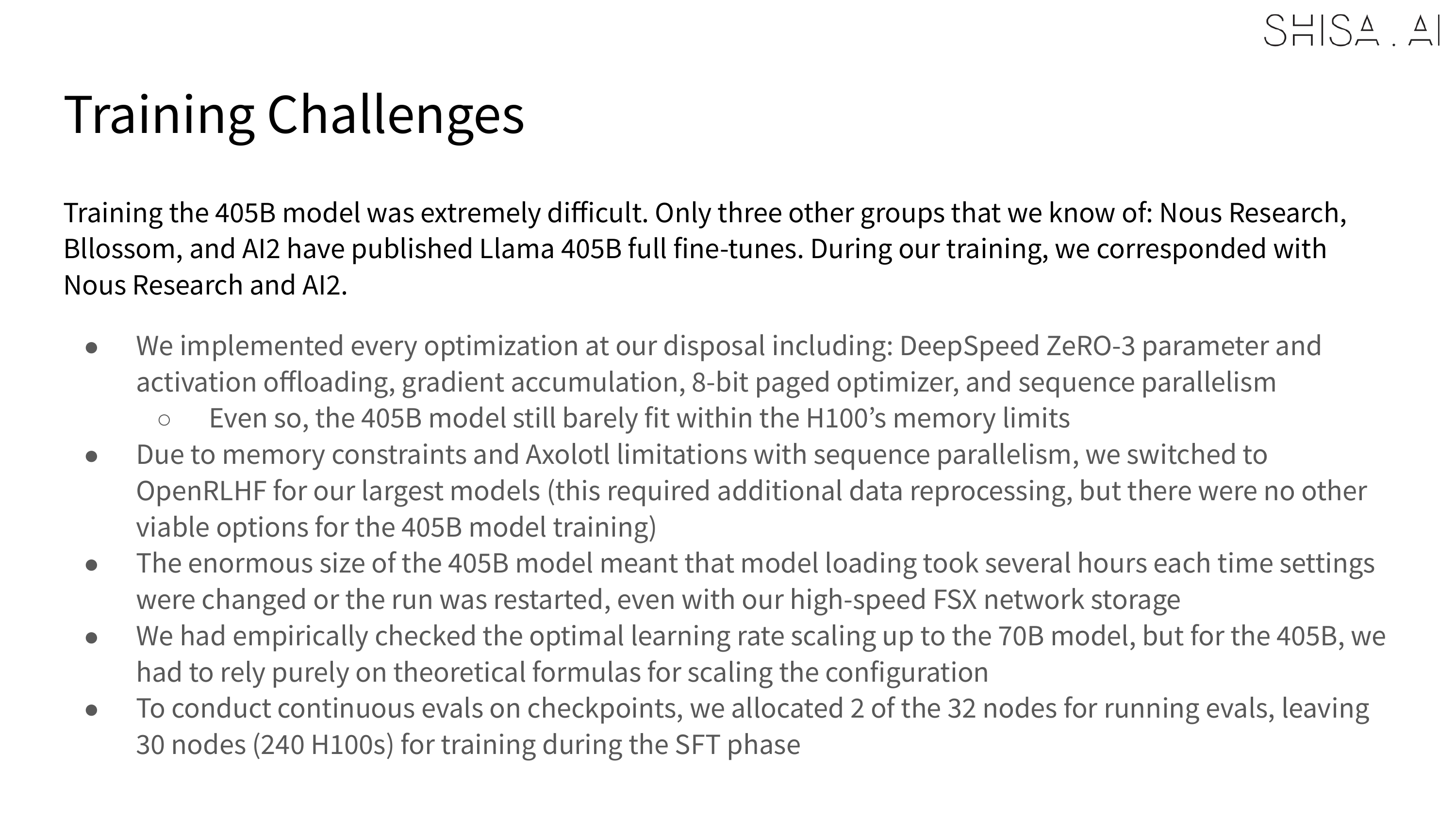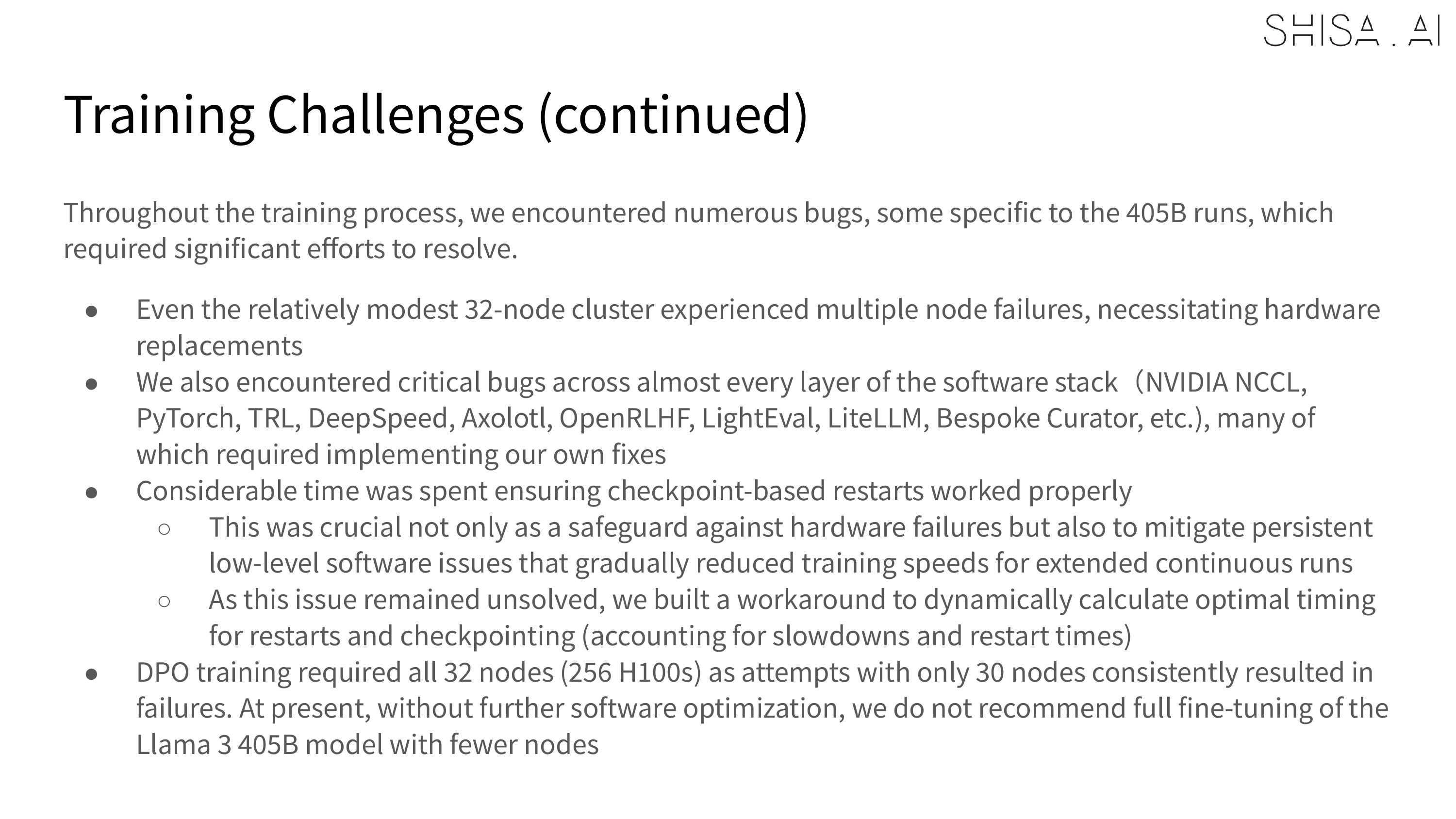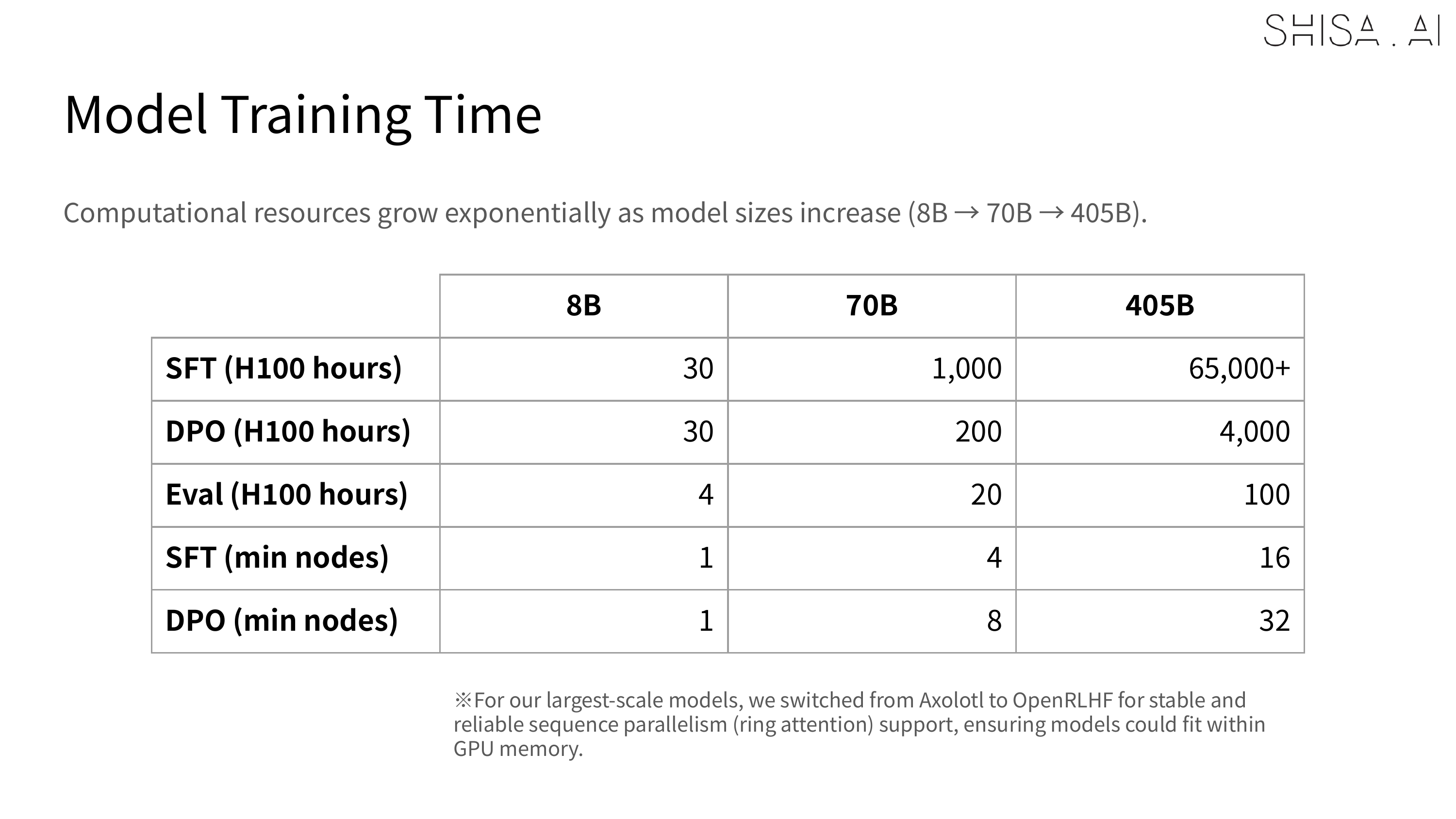 While we validated that 16 H100 nodes could be used to SFT a 405B model, to meet deadlines our final training expanded to a 32 H100 node (256 GPU) Slurm cluster. For SFT, 30 nodes (240 H100 GPUs) were used for training, with 2 nodes allocated for continuous evaluation of checkpoints. The DPO was trained on all 32 H100 nodes (256 H100 GPUs) and always crashed, even after many attempted optimizations at 30 nodes. Overall training time for the final 405B model was approximately 65,000+ H100 hours for the SFT and 4,000 H100 hours for the DPO over the course of about 2 weeks in April 2025. As a point of comparison, training Shisa V2 70B took only 1200 H100 hours for SFT+DPO.