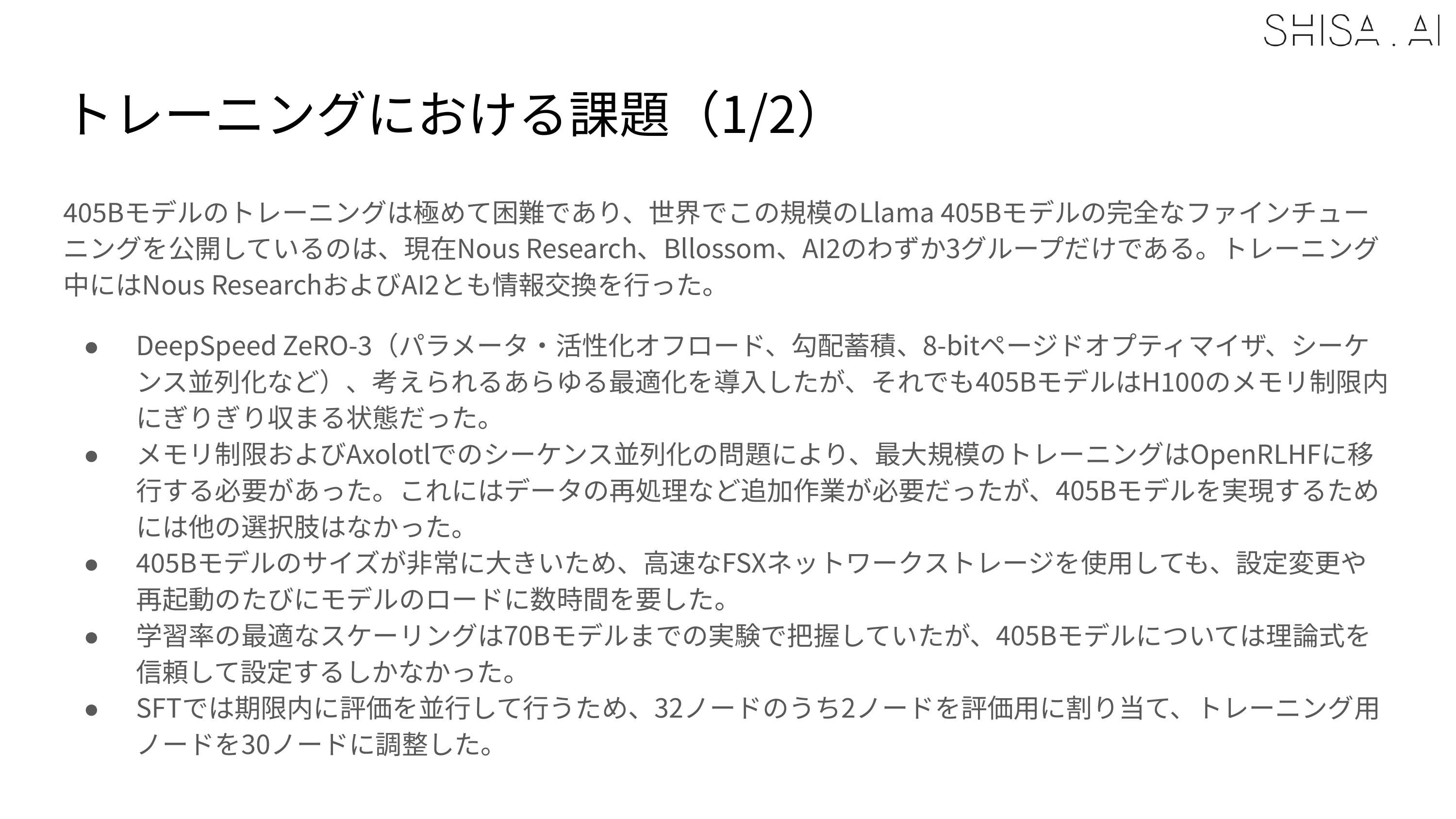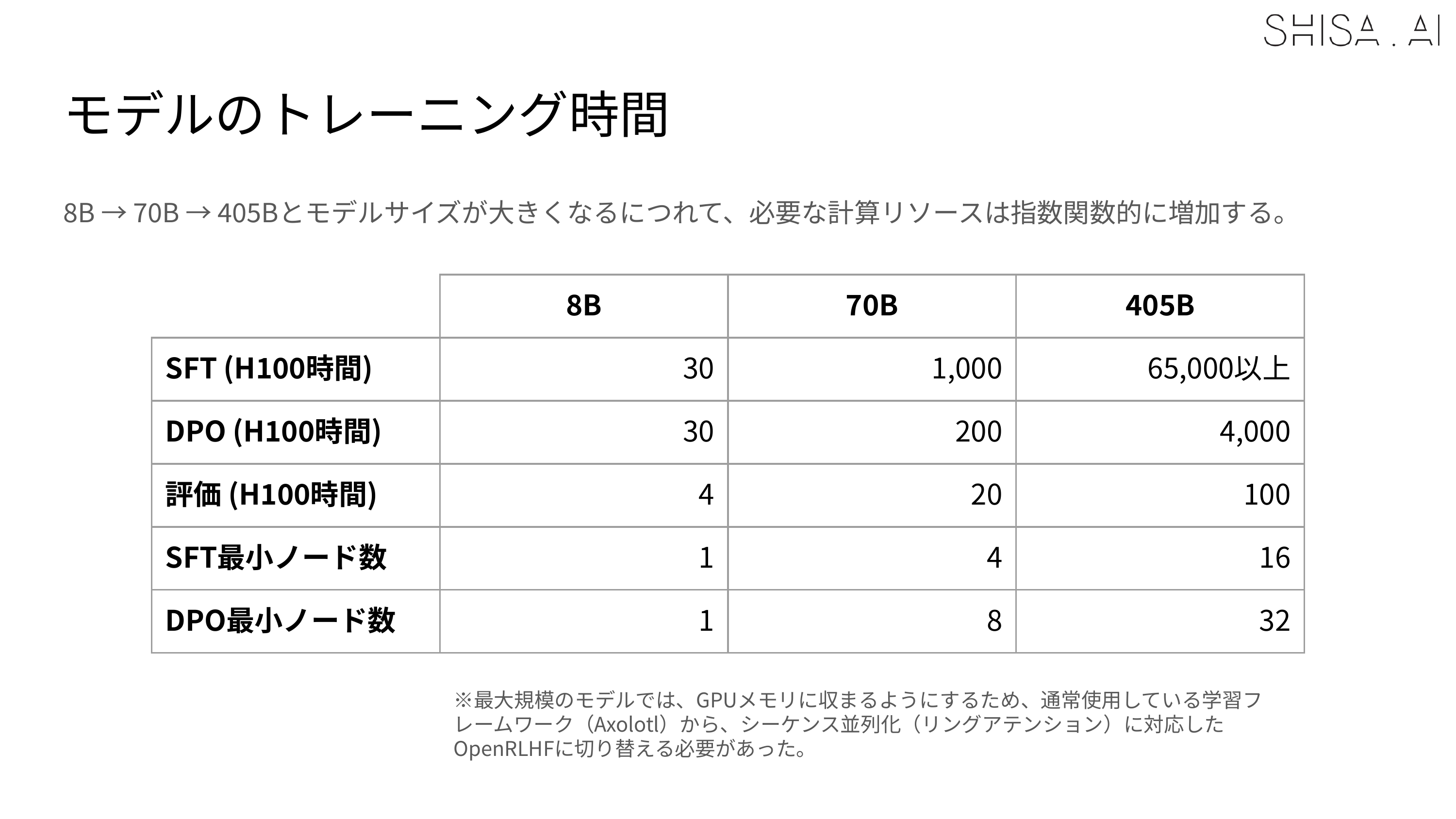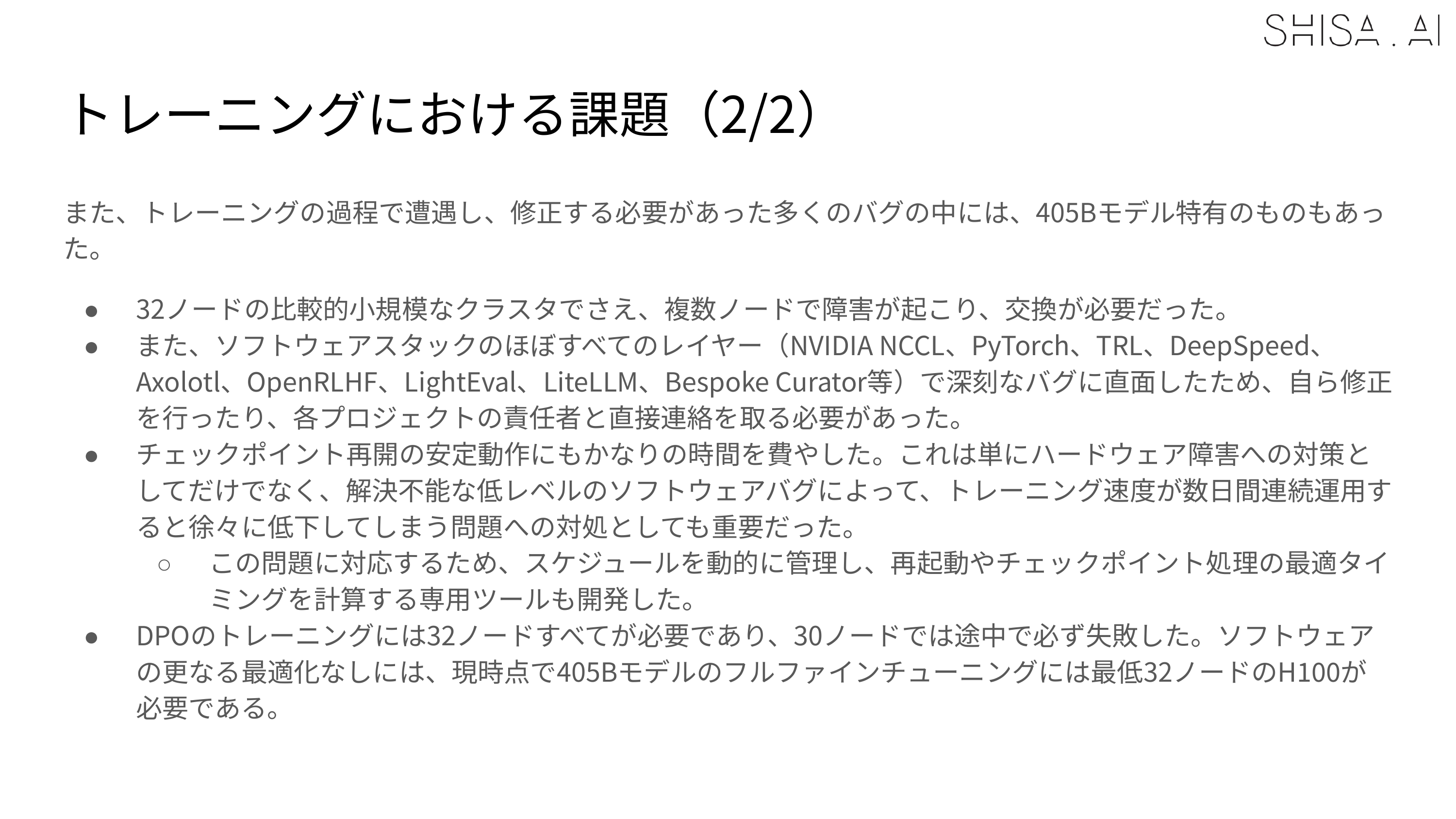 While we validated that 16 H100 nodes could be used to SFT a 405B model, to meet deadlines our final training expanded to a 32 H100 node (256 GPU) Slurm cluster. For SFT, 30 nodes (240 H100 GPUs) were used for training, with 2 nodes allocated for continuous evaluation of checkpoints. The DPO was trained on all 32 H100 nodes (256 H100 GPUs) and always crashed, even after many attempted optimizations at 30 nodes. Overall training time for the final 405B model was approximately 65,000+ H100 hours for the SFT and 4,000 H100 hours for the DPO over the course of about 2 weeks in April 2025. As a point of comparison, training Shisa V2 70B took only 1200 H100 hours for SFT+DPO.