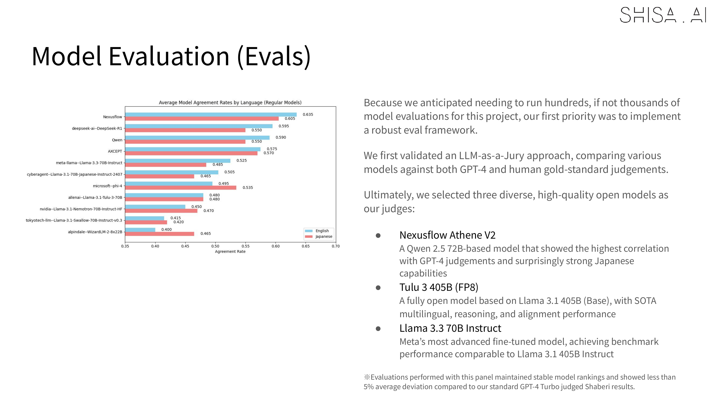 From the outset, we knew that we would need to run hundreds, if not thousands of model evaluations for this project, so beyond implementing a robust set of evals and eval framework, we also empirically and statistically validated an LLM-as-a-Jury approach, comparing various models against both GPT-4 and human gold-standard judgments, and ultimately selecting a panel of three diverse, high-quality open models as our judges. This panel both maintained stable model rankings, and showed less than 5% average deviation compared to our standard GPT-4 Turbo judged Shaberi results.