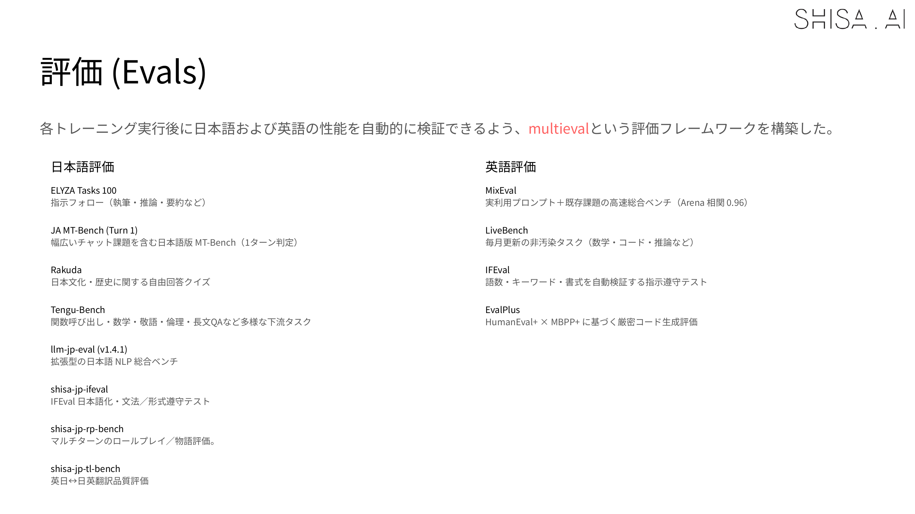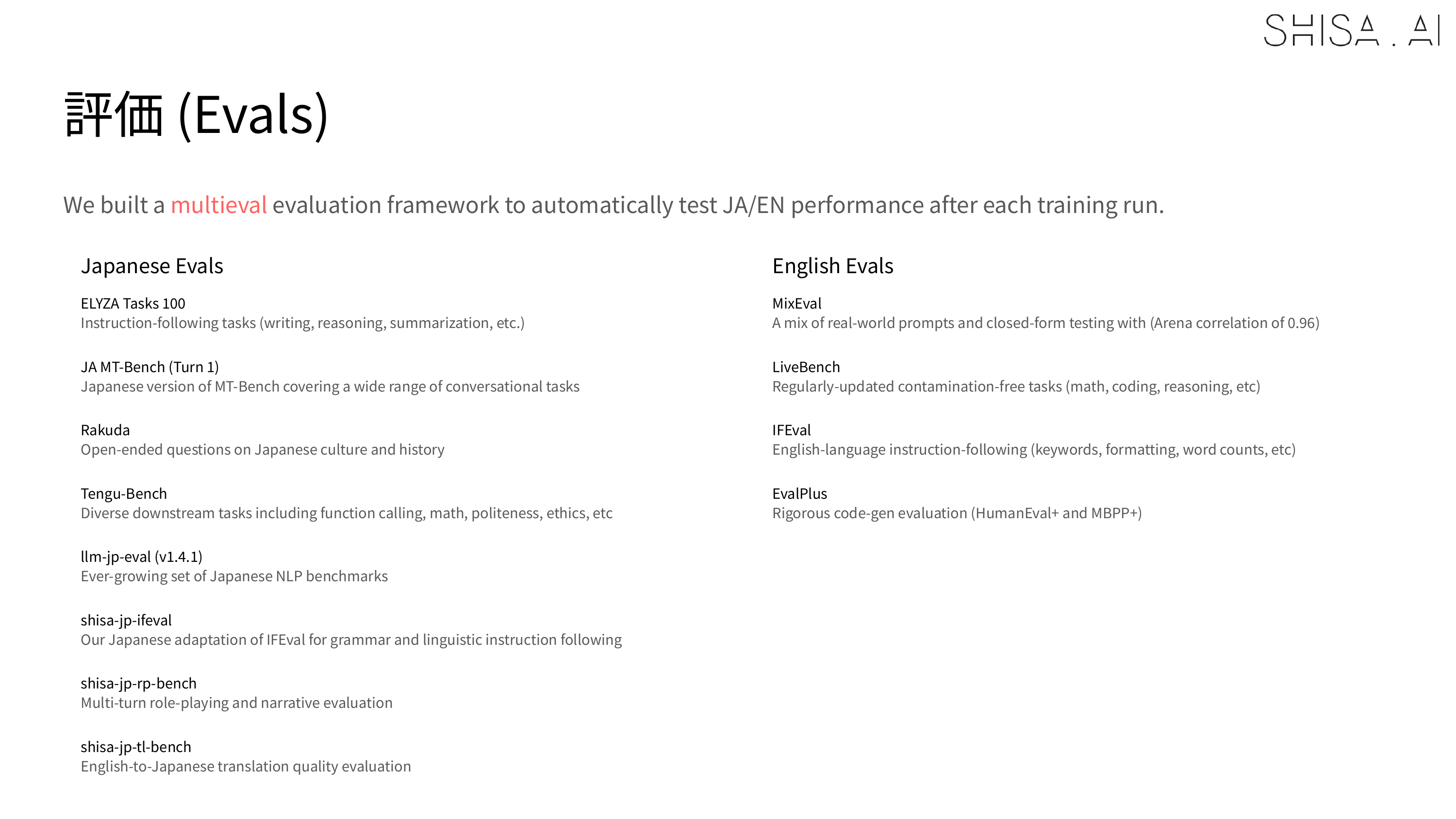 We ran hundreds of experiments building our Shisa V2 models, and we created a custom multieval framework to automatically run a diverse set of standard Japanese (ELYZA Tasks 100, JA MT-Bench, Rakuda, Tengu-bench, llm-jp-eval) and English (MixEval, LiveBench, IFEval, EvalPlus) evals to keep our model development on track.