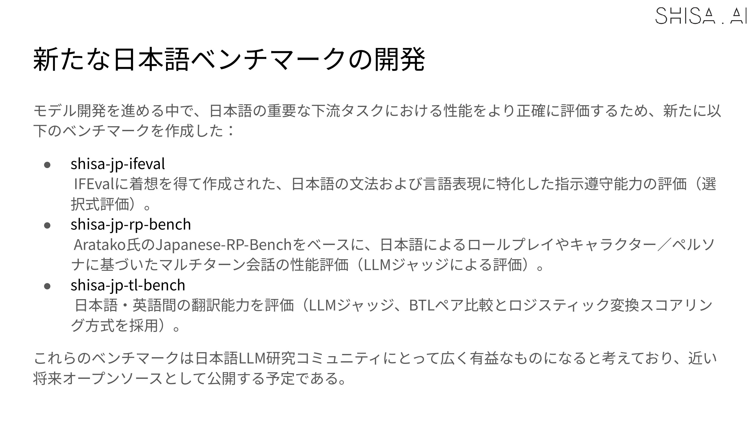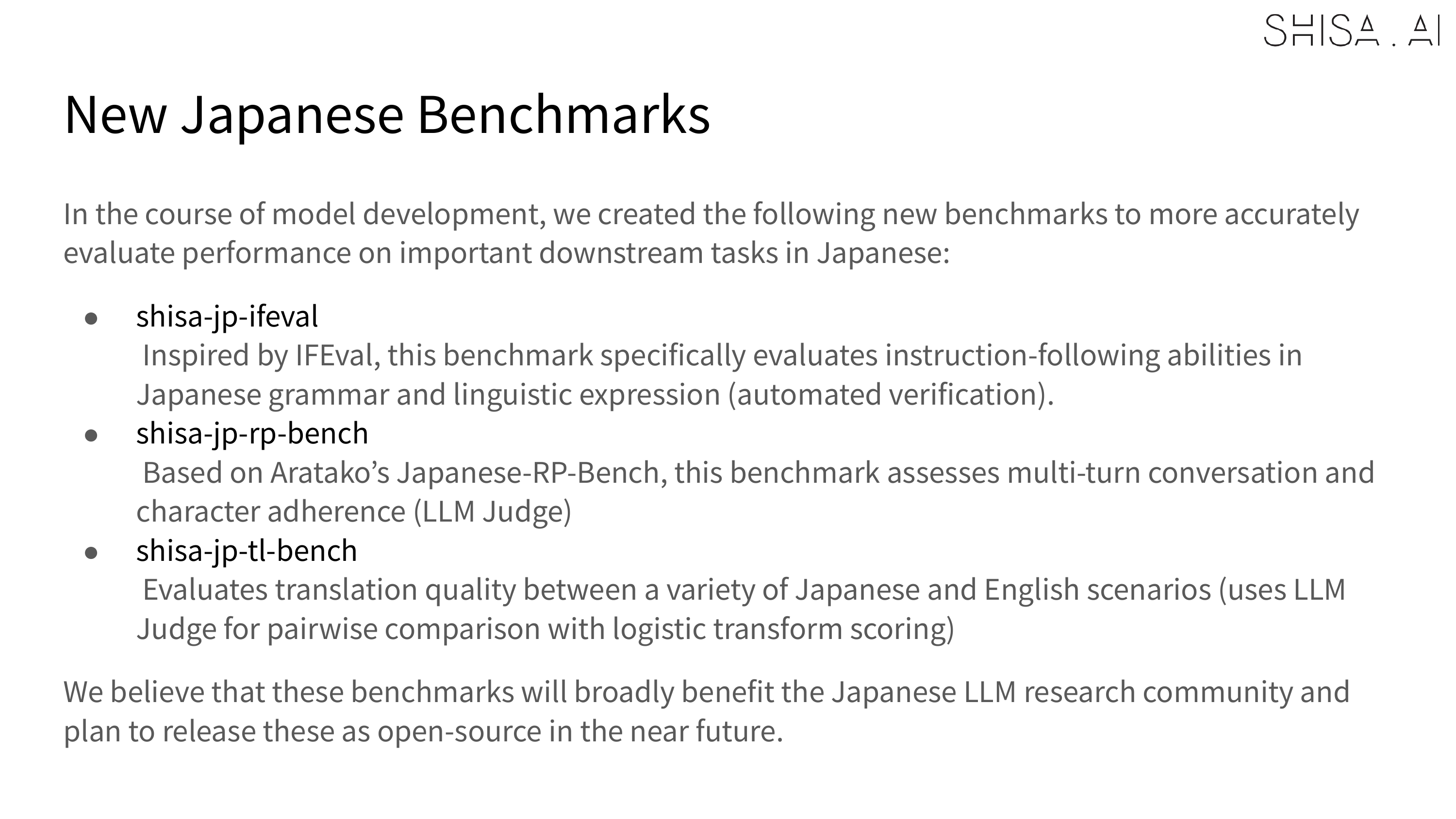 - shisa-jp-rp-bench: Assessing performance on Japanese role-play and character/persona-based multi-turn conversations based on Aratako’s Japanese-RP-Bench (LLM judge)