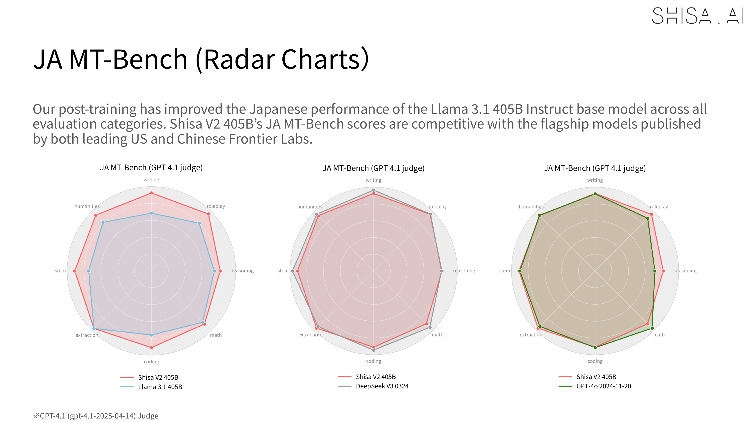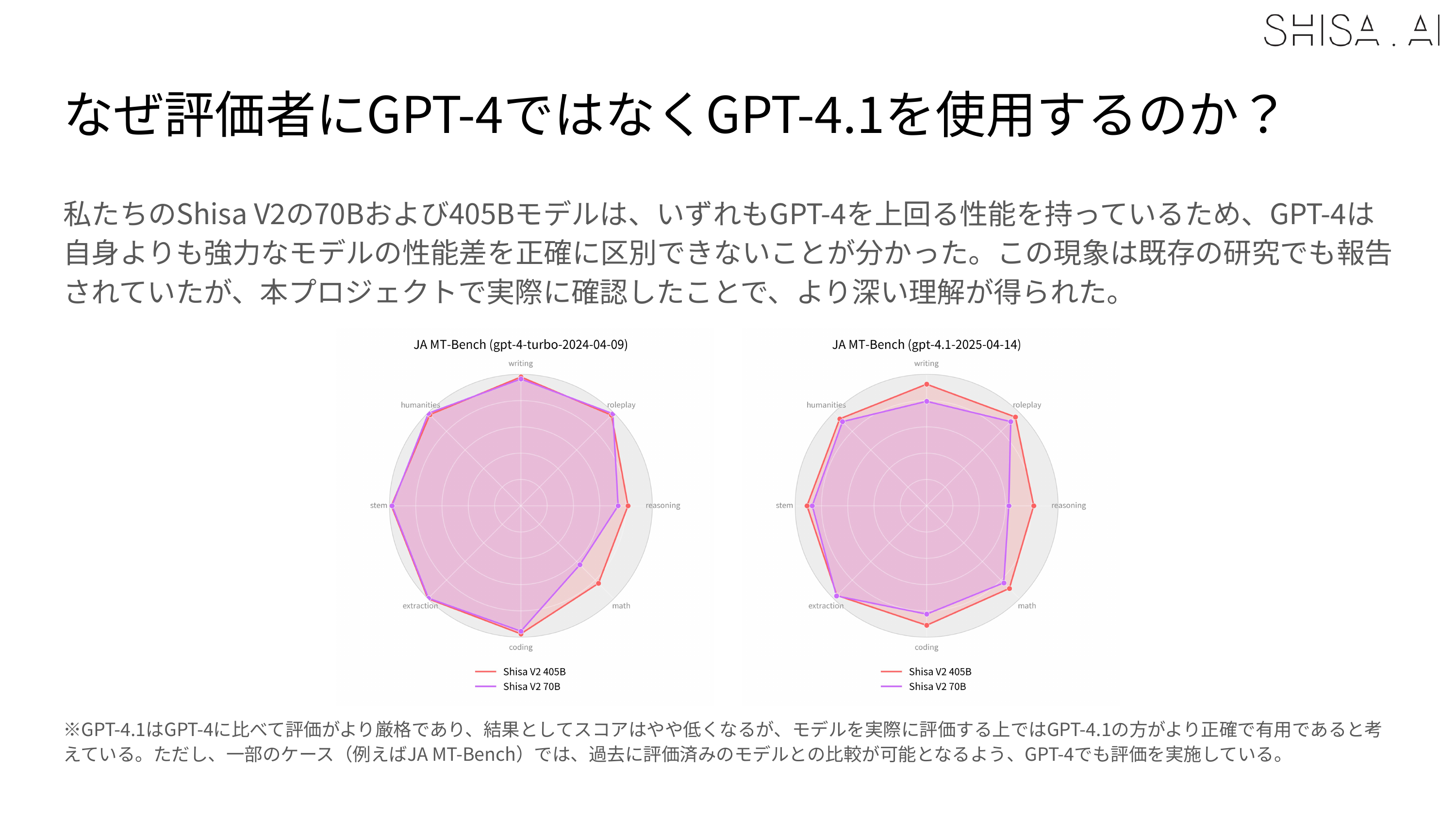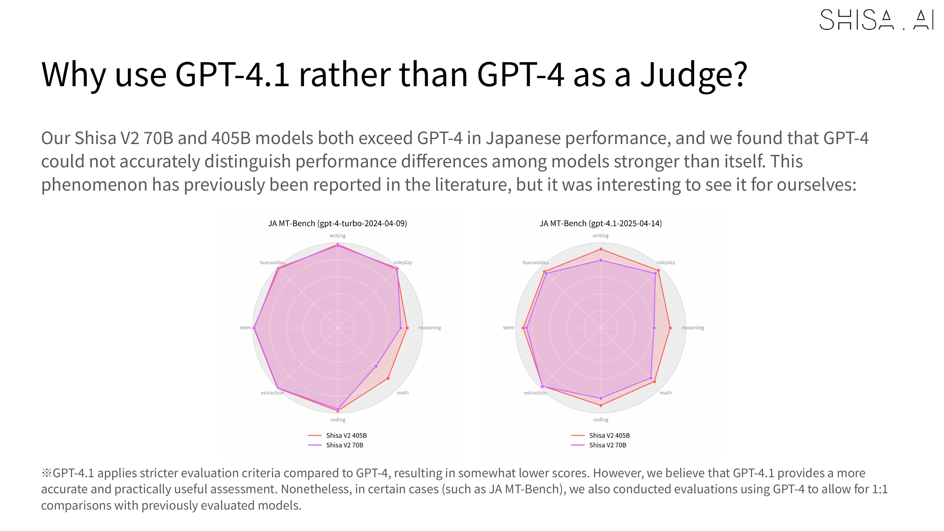 However, one of the limitations we discovered, which aligns with similar observations made in recently published literature, is that we found that weaker models like GPT-4 or our LLM-as-a-Jury panel were less able to accurately evaluate stronger models like Shisa V2 405B. For example, in our JA MT-Bench testing, GPT-4 Turbo was not able to distinguish scoring between our 70B and 405B in most categories, while GPT 4.1 was: