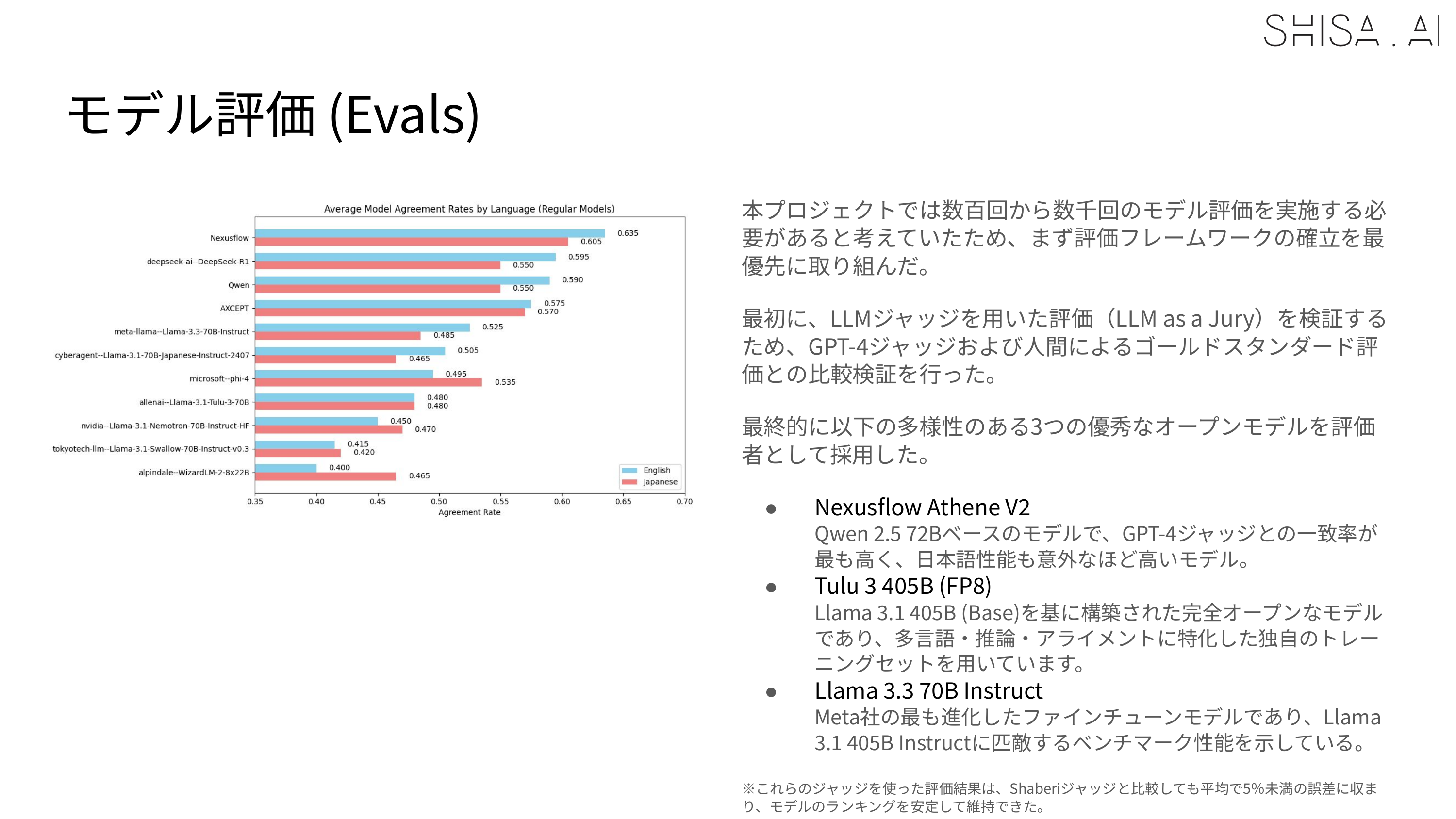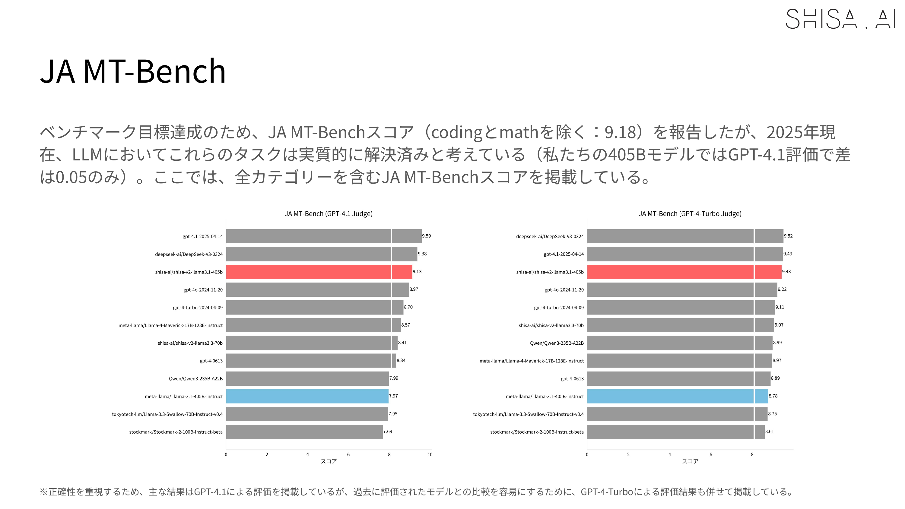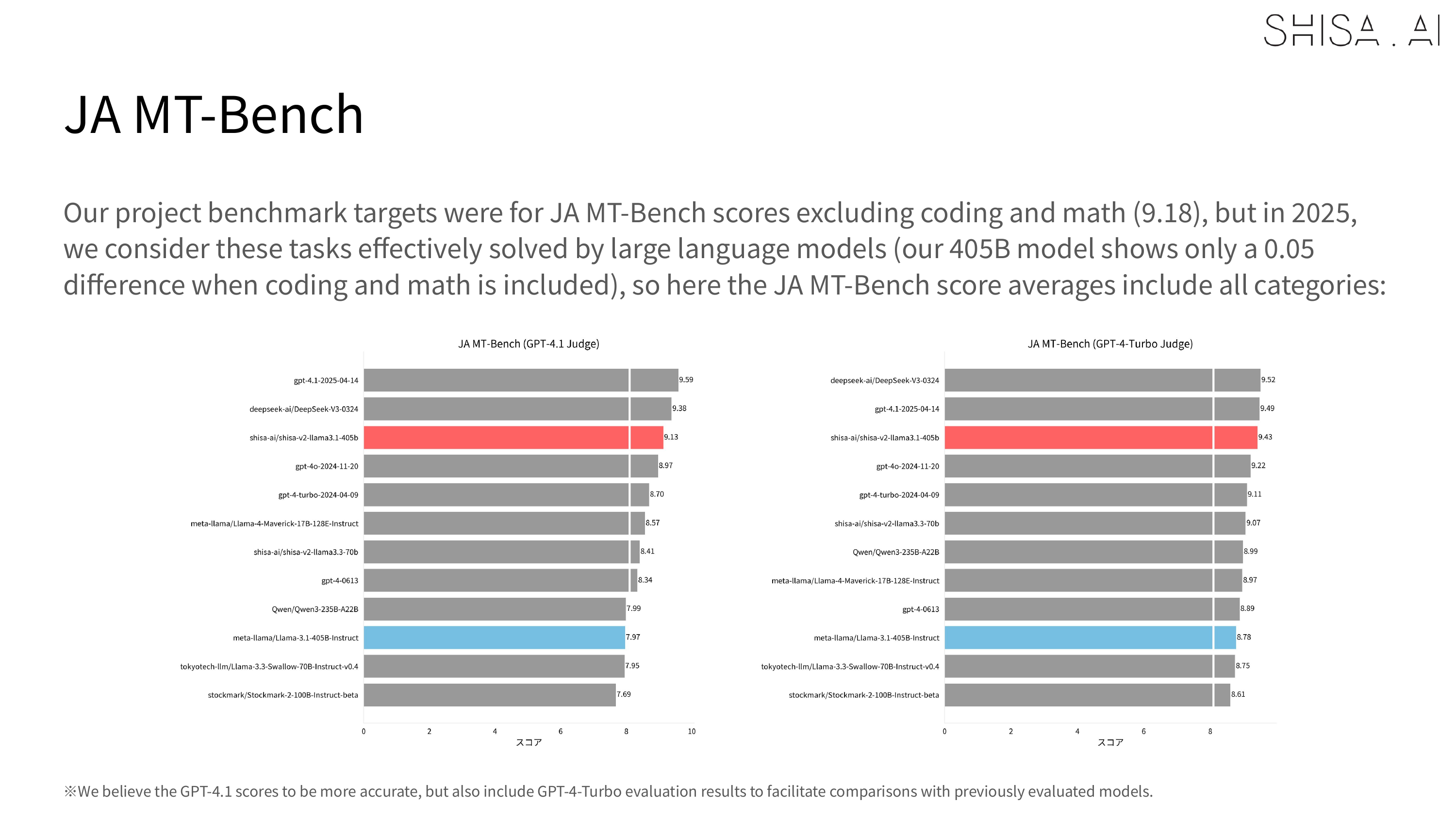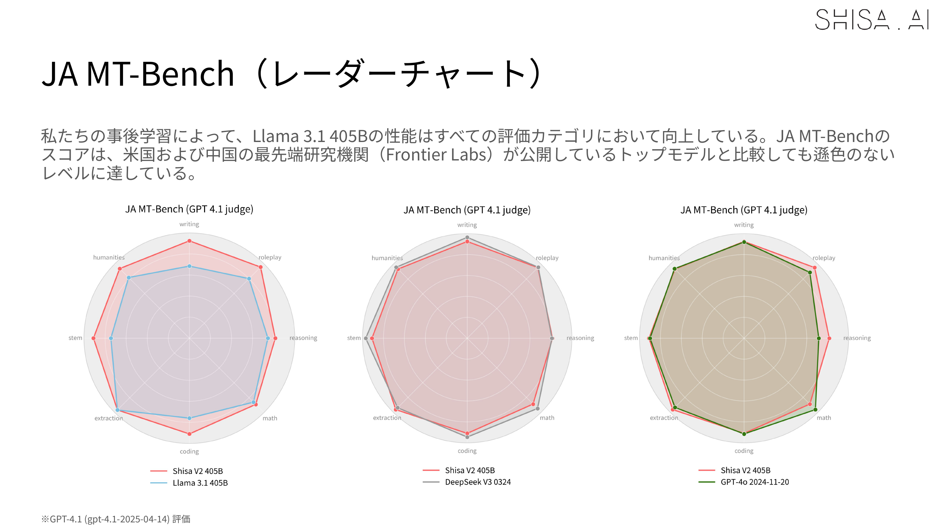 However, one of the limitations we discovered, which aligns with similar observations made in recently published literature, is that we found that weaker models like GPT-4 or our LLM-as-a-Jury panel were less able to accurately evaluate stronger models like Shisa V2 405B. For example, in our JA MT-Bench testing, GPT-4 Turbo was not able to distinguish scoring between our 70B and 405B in most categories, while GPT 4.1 was: